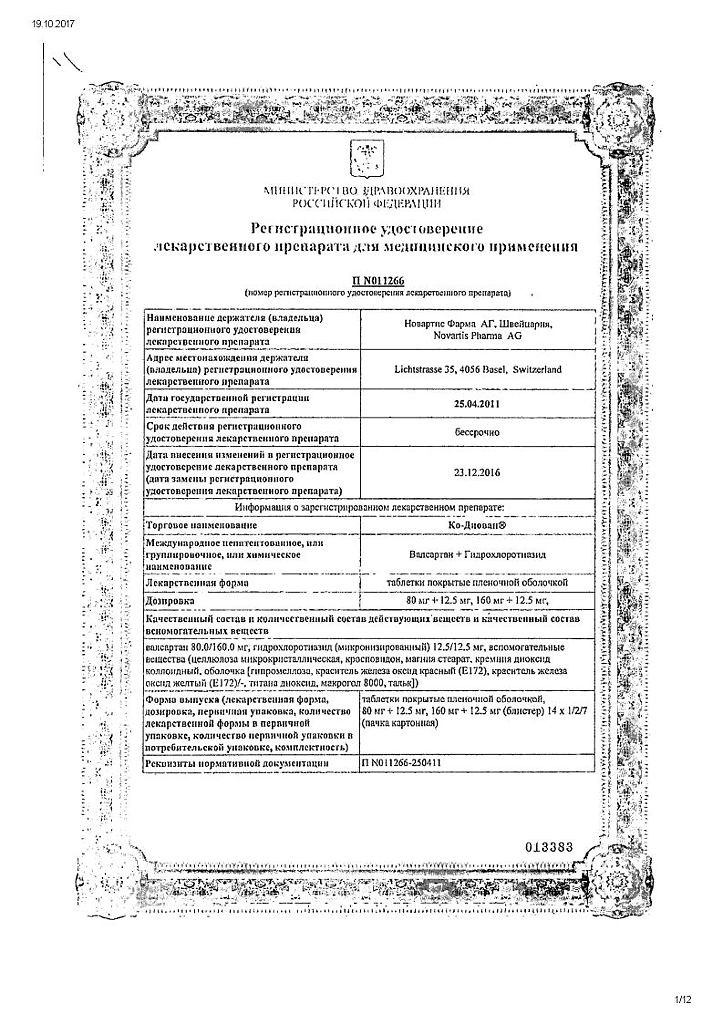 Co-Diovan принимается перорально. По 1 табл. 1 раз в сутки ежедневно. В зависимости от клинической ситуации, рекомендуемая суточная доза составляет 1 табл. 80 12,5 или 160 12,5 мг. При необходимости назначают по 1 табл. 160 25 мг в сутки. Препарат Ко-Диован можно применять независимо от употребления пищи. Максимальная суточная доза составляет 320 мг/25 мг. Максимальный антигипертензивный эффект достигается в течение 2–4 нед.