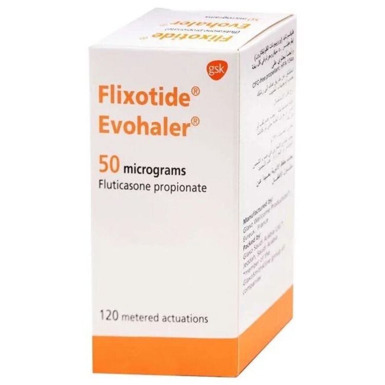 Препарат поставляется в картонной коробке с маркировкой на иностранном языке. В упаковке содержится ингалятор, рассчитанный на 120 доз. На коробке указаны название препарата "Flixotidt Evohaler", дозировка, действующее вещество и количество доз. Коробка оформлена в бело-оранжевых тонах с логотипом производителя GSK. Информация о производителе и другие необходимые данные также приведены на упаковке.