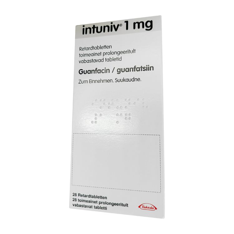 Препарат обычно упакован в картонную коробку белого или светлого цвета. На передней и боковых сторонах коробки присутствуют надписи «Intuniv» и указание дозировки «1 мг».