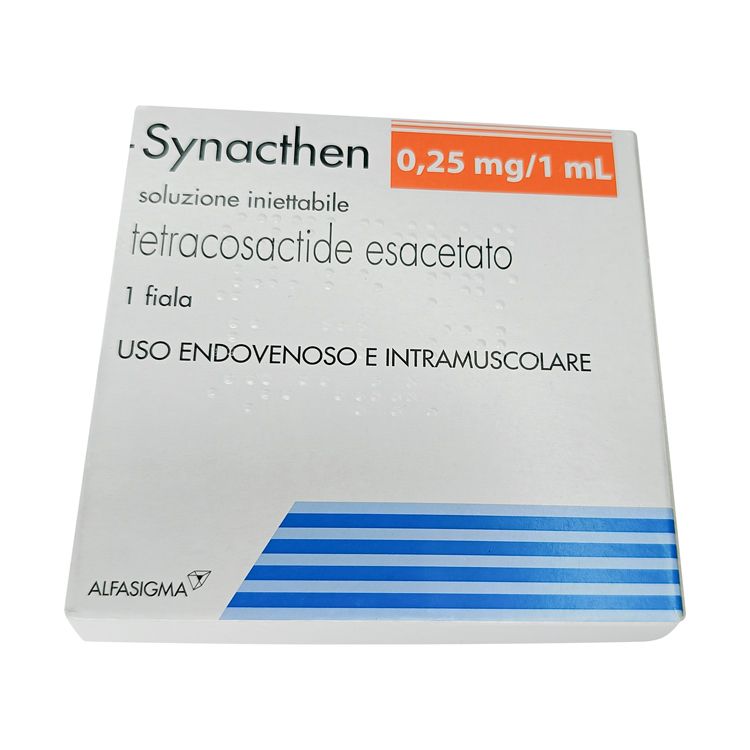 Лекарство поставляется в коробке, содержащей одну ампулу объемом 1 мл. На упаковке указаны название препарата — «Synacthen», концентрация действующего вещества (0,25 мг/мл), а также путь введения — внутримышечный и внутривенный.